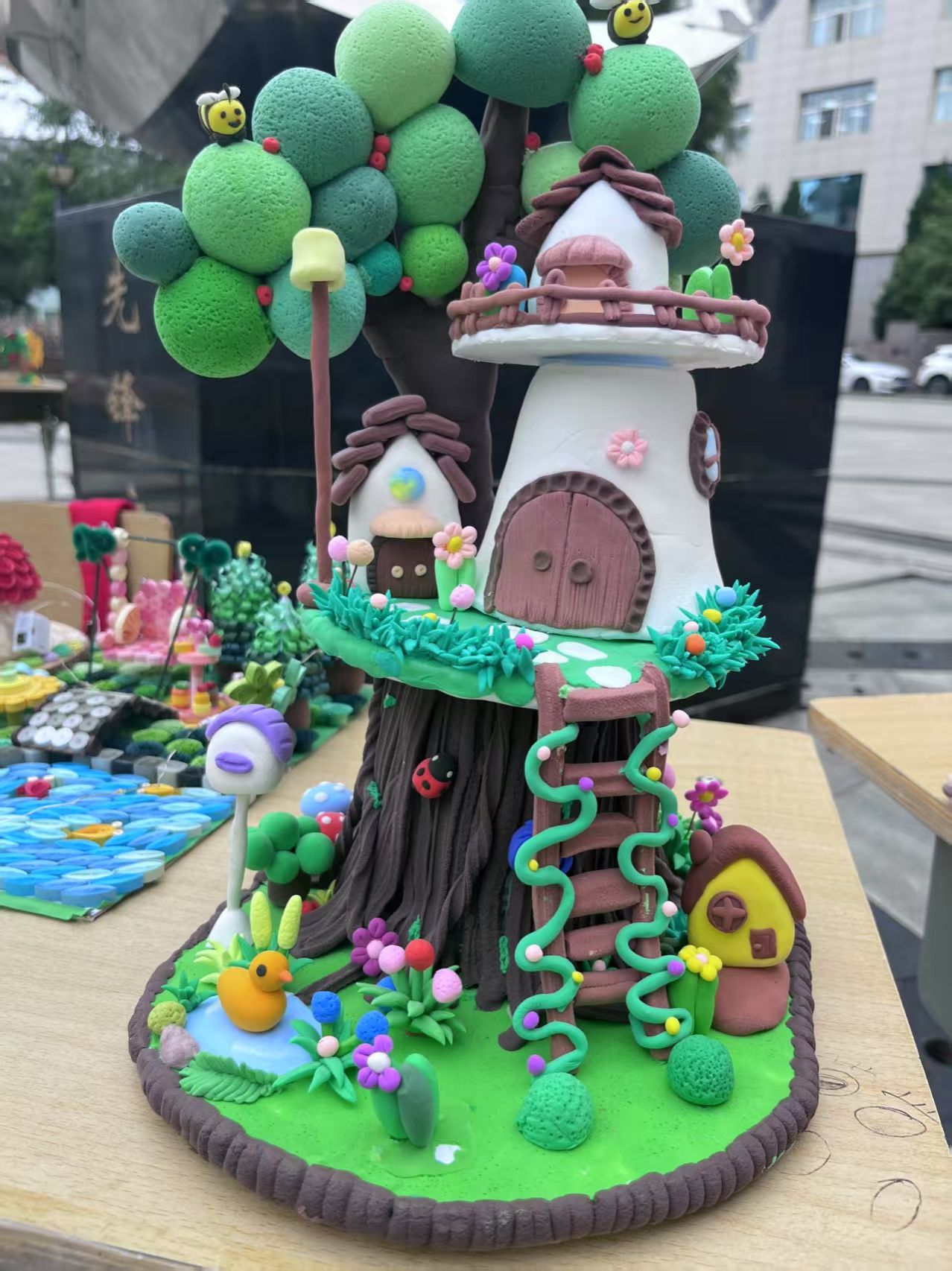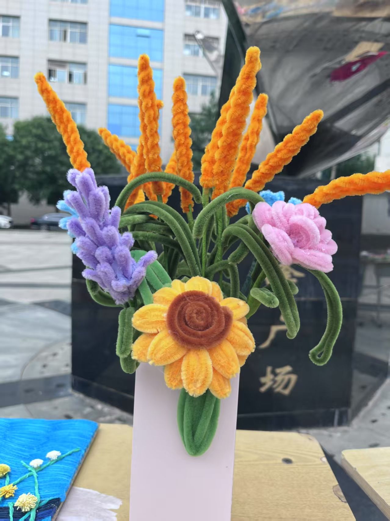 在这些作品中有衍纸生花,彩色纸条被巧妙卷曲、粘贴,形成了娇艳的花朵和灵动的蜻蜓,仿佛是流动的色彩诗篇;扭扭棒焕彩,用扭扭棒制作的的簪花花环,如同春天里最美的风景,插在花瓶中的扭扭棒花束,散发着温馨的气息;泡泡泥造境趣,将泡泡泥变成形态各异的大自然生物、灵动的珊瑚与神秘的礁石,构建出一个充满想象力的微观世界,将生肖形象以手工形式呈现于时钟表盘,既让传统生肖文化变得直观可感,又赋予时钟艺术价值;织布织梦,用不织布缝制,凭借丰富色彩与别致造型,创作出生动形象,传递温暖质朴的美感。