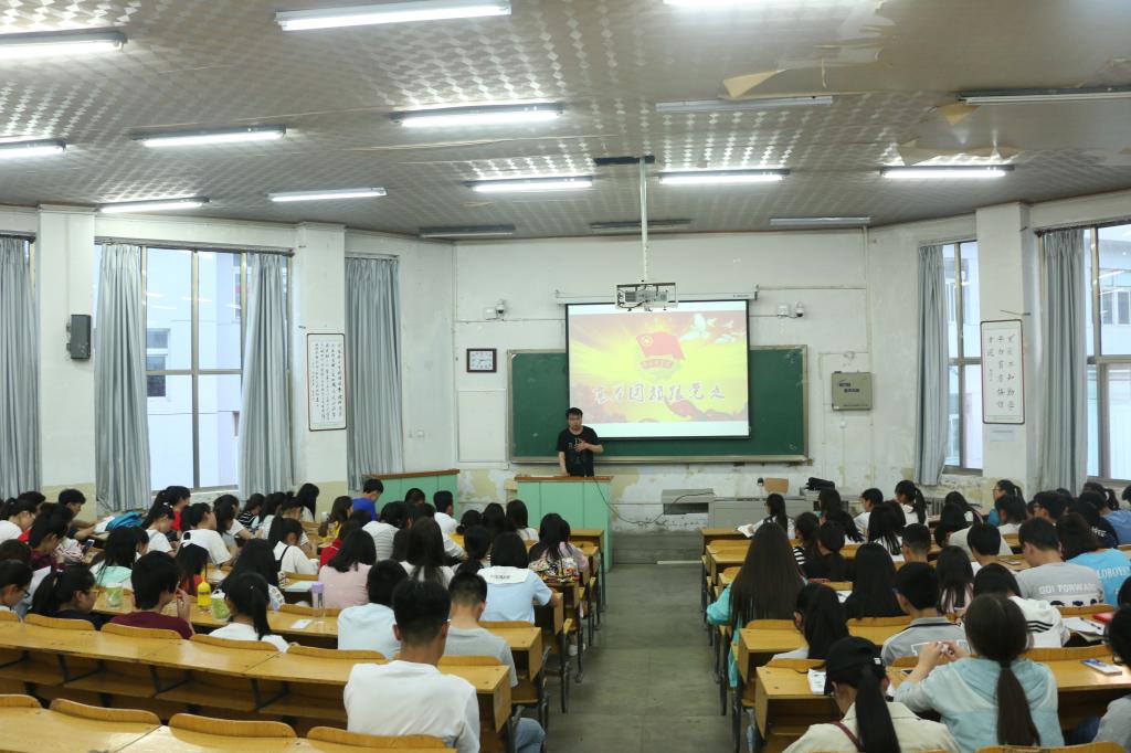 团委组织2016级全体团员在第三阶梯教室开展“高举团旗跟党走”的主题教育活动。