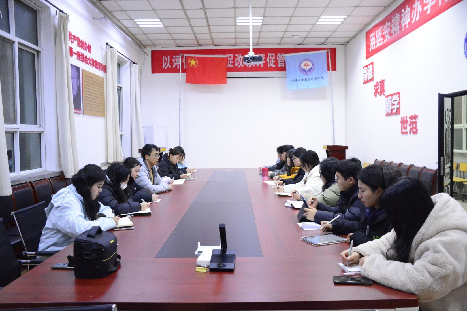 于如心楼二楼会议室召开新学期学生工作部署会议,对新学期工作进行安排与部署。本次会议由王浩老师主持,学生会主席团、圣地红烛负责人、心理驿站负责人及各部门负责人共同参与,围绕工作规划、协同创新、加强服务等维度展开研讨,为新学期工作擘画蓝图。